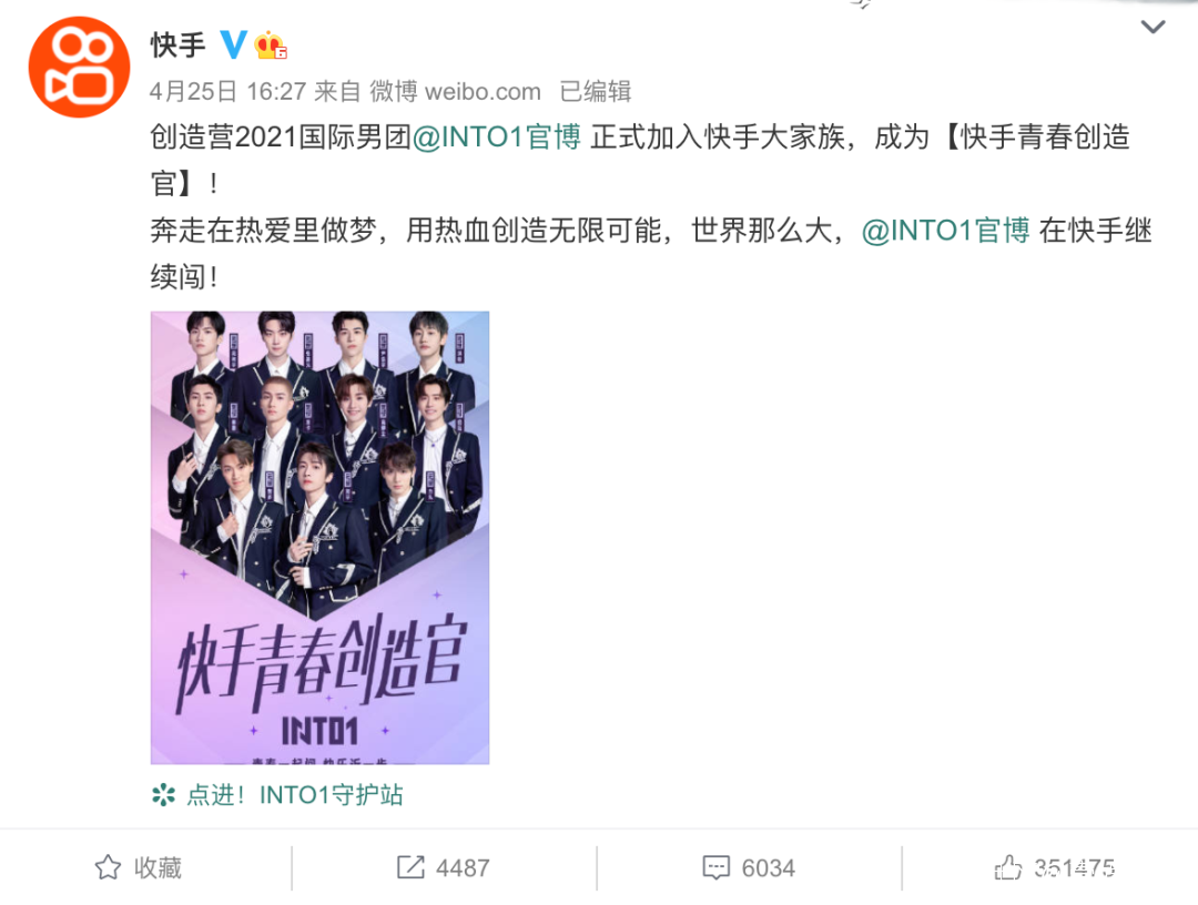 另外,快手也在海花島的成團夜結束當晚,向剛剛成立的國際男團組合“INTO1”拋出了橄欖枝,讓INTO1以“快手青春創造官”的身份加入快手,未來以直播和短視頻形式和快手用户產生更多元互動,INTO1剛成團的第一個“星辰大海”便已確定。
