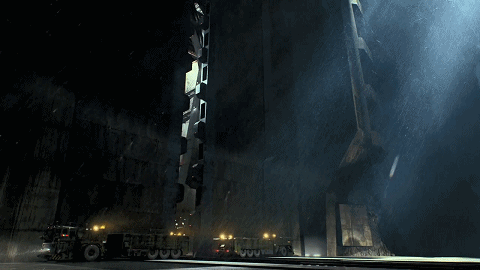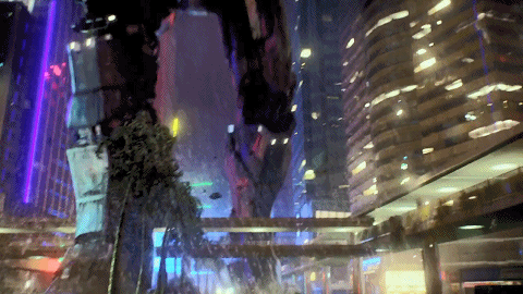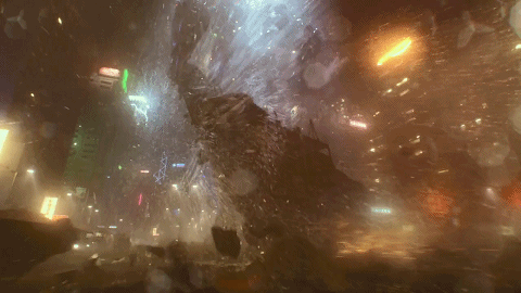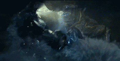 它們行動遲緩但破壞力無窮,動作慢但動勢大,力量的釋放與化解都變得無比可感,呈現出速度與加速度之間的張力,也就呈現出了本體重量與施加力量的關係——不僅僅用仰拍、實物的對比來直接表現規模,而是在動作設計中時刻透露着它們的巨大。