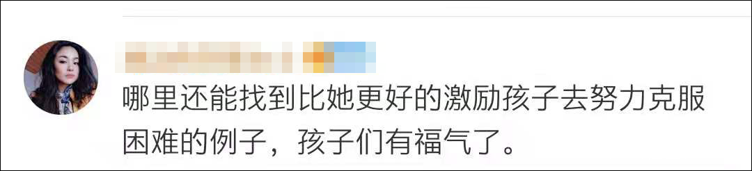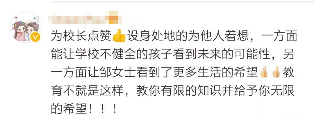 王校長説:“我覺得不管從她的這種經歷,還有她面對挫折之後付出的努力,還有她從言談中表現出來的那種樂觀和向上的態度,確實很不容易。而且我看到她還去美國留學,在殘疾的情況下拿到了很多學位,覺得這孩子很上進。”