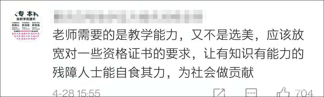許多網友呼籲:“放寬一些資格證書的要求,讓有知識有能力的殘障人士能自食其力。”