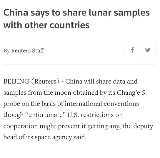 去年嫦娥五號再次登陸月背,並帶回了稀有的土壤樣本,各個國家都希望能分到一點做研究,中國也都大方的分享了,但唯獨沒給美國, NASA 還在推上希望中國能分享。。。