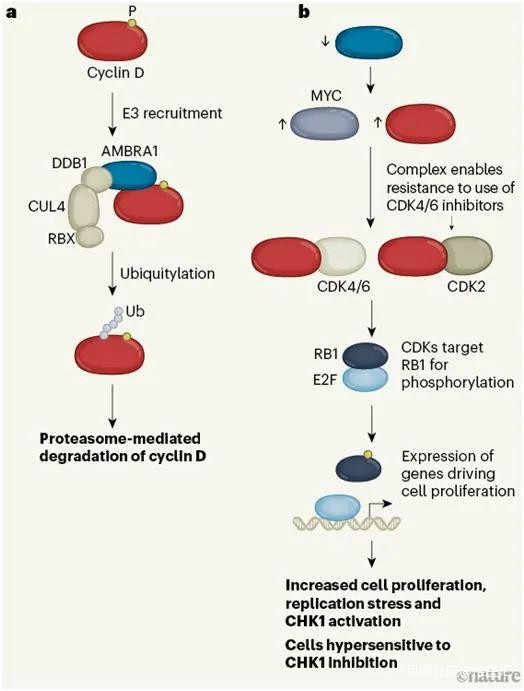 第一項研究和第二項研還證實,AMBRA1的丟失以及細胞週期蛋白D的同時增加,導致人類腫瘤細胞對CDK4/6抑制劑的敏感性下降。有趣的是,這些作者報告説,在AMBRA1缺失的細胞中,細胞週期蛋白D1不是主要與CDK4/6合作,而是與細胞週期蛋白依賴性激酶CDK2形成一種具有催化活性的複合物,而且這種複合物對CDK4/6抑制劑不敏感。
