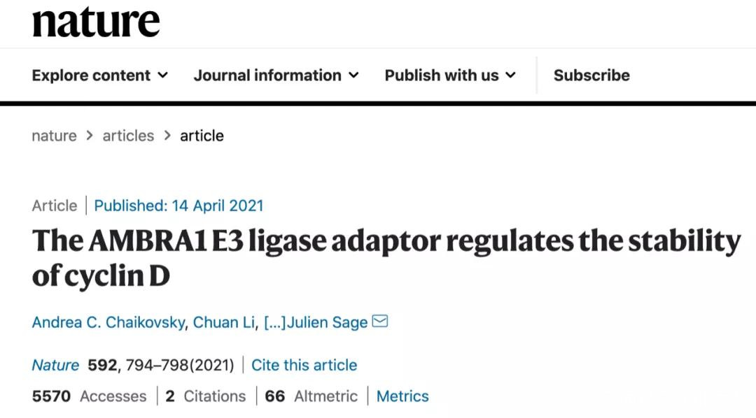 2.Andrea C. Chaikovsky et al. The AMBRA1 E3 ligase adaptor regulates the stability of cyclin D. Nature, 2021, doi:10.1038/s41586-021-03474-7.