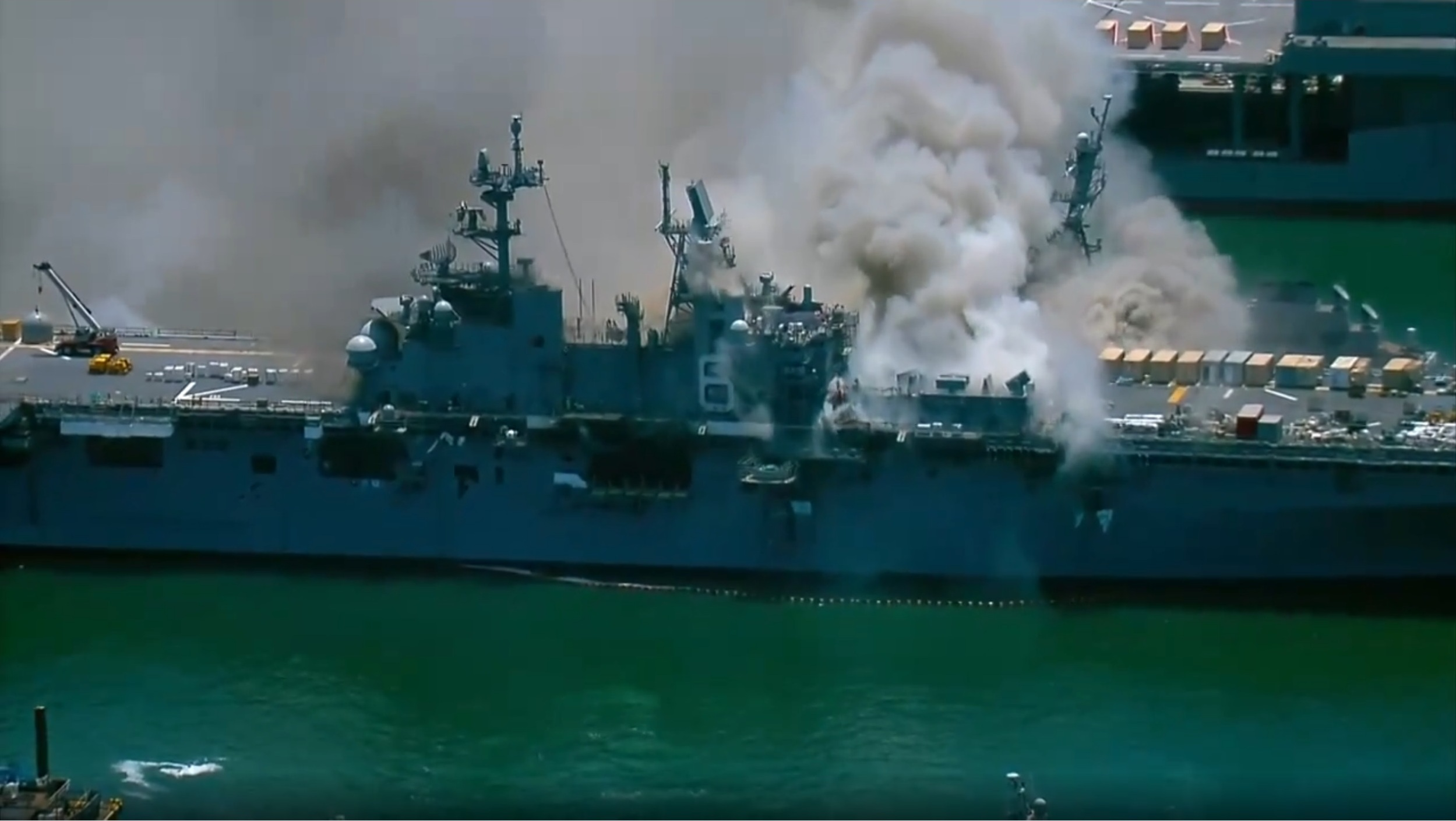 據觀察者網此前報道,去年7月12日早上8點多,停泊在聖迭戈海軍基地的“好人理查德”號發生爆炸後起火,大火連燒四天,導致該艦14層甲板中有11層遭受不同程度的損傷,艦島幾乎被完全燒燬,艦島以下幾層甲板的部分區域完全損毀,飛行甲板部分區域扭曲變形。