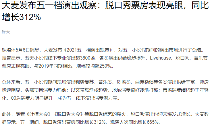 大麥發佈報告顯示,五一假期線下專業演出超3800場,其中Livehouse、脱口秀、音樂節票房與2019年同期相比,增幅較均超250%。市場消費結構趨於年輕化,00後消費力明顯提升,成為五一線下演出消費潛力軍。