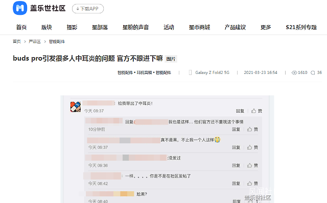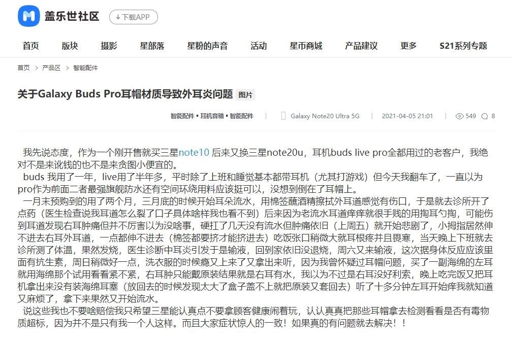 中國蓋樂世社區,以及社交平台微博上同樣有用户反映類似問題,稱“Galaxy Buds Pro耳機用了兩天就開始耳朵不適,開始流膿”。