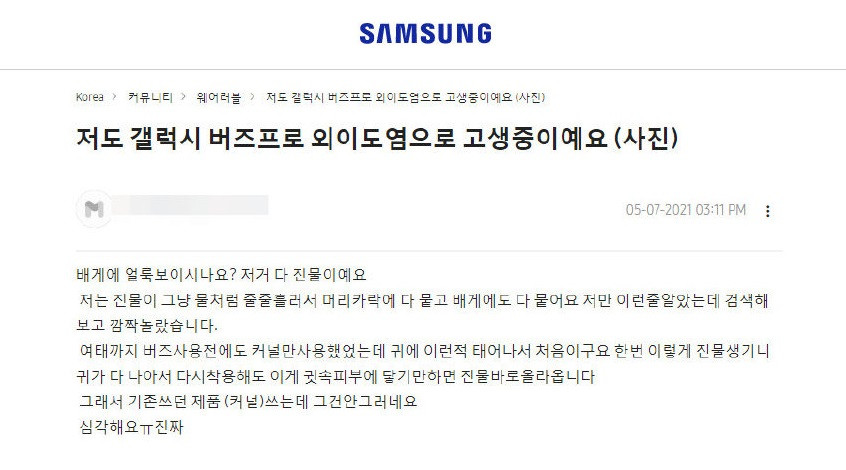 其中一位用户稱,“(使用Galaxy Buds Pro耳機後感到不適)去耳鼻喉科被診斷為外耳道炎,接受治療已經痊癒了,但是使用Galaxy Buds Pro耳機一天後,炎症又復發了”,“以前使用同為入耳式的Galaxy Buds耳機時,整天戴着也沒問題,但現在卻是第一次患上外耳道炎”。