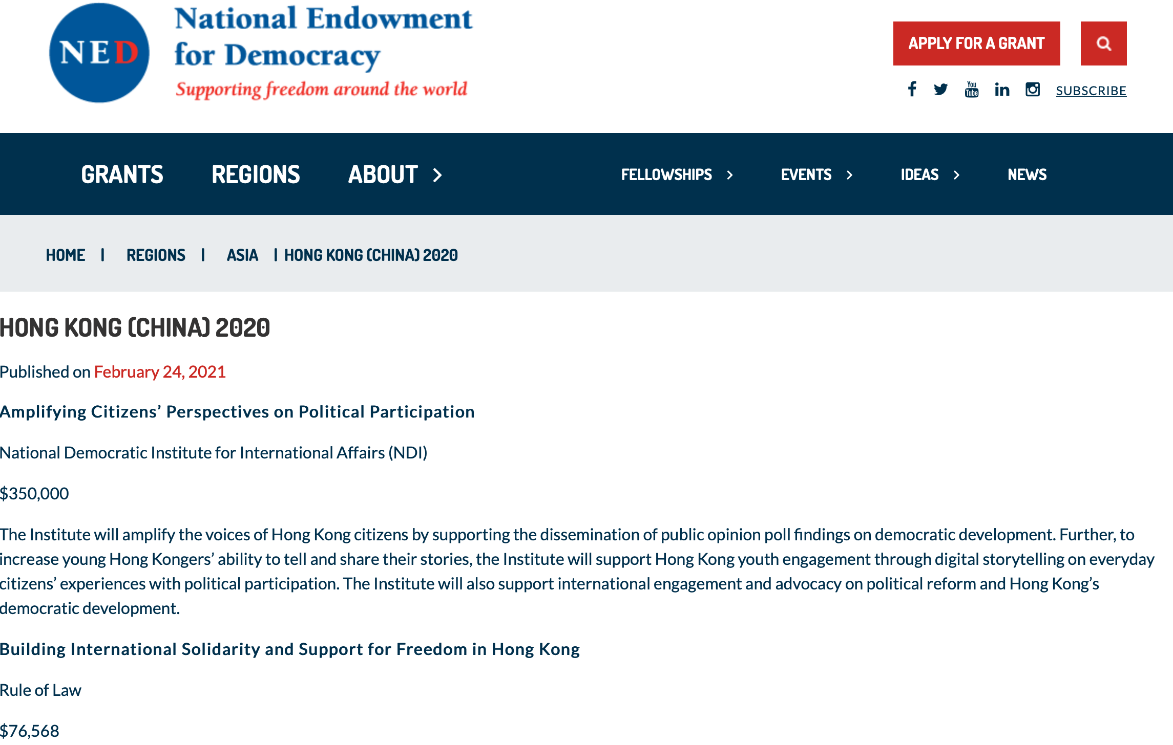 但是為此洗白的也大有人在,最近香港的一個政論節目,仍有資深傳媒人向警務處長鄧炳強問及「外國勢力參與香港抗爭」的證據,也正如鄧的回應,的確是在侮辱香港人的智慧。這些機構一再滲透不同地區,例如聯繋香港高等院校和政界中的反對派丶滲透教學內容丶培訓抗爭工作,美國政府邀請反對派訪問丶硏究制裁香港丶傳媒老闆高調説站在美國一方,這些已經不只外國滲透參與,應該説是直接行動。