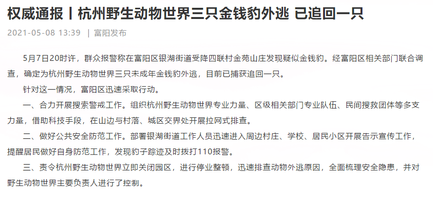“5月7日20時許,羣眾報警稱在富陽區銀湖街道受降四聯村金苑山莊發現疑似金錢豹。經富陽區相關部門聯合調查,確定為杭州野生動物世界三隻未成年金錢豹外逃,目前已捕獲追回一隻。”