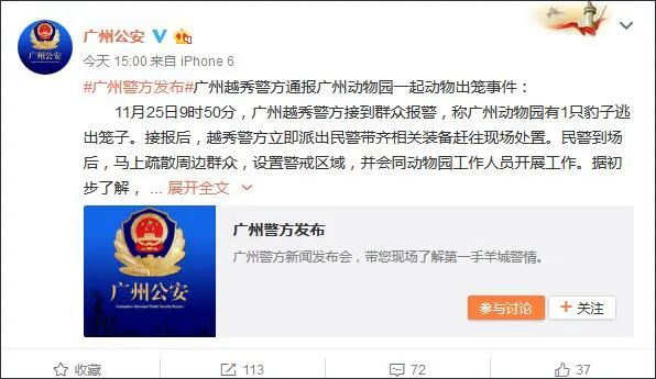 2017年廣州動物園也曾有豹子出逃,好在反應及時,10分鐘後被尋回 圖源網絡