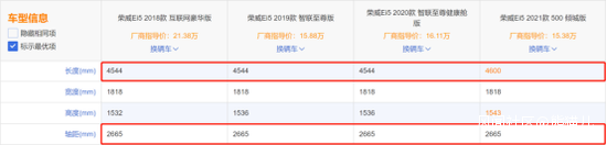 比如上汽榮威的暢銷車型Ei5,從2018年到2021年,經歷三次升級改款,其中前兩次車身長度都沒比,均為4544毫米,而2021年3月最新的這次升級呢,長度恰好4600毫米,關鍵是在長度加了56毫米的同時,代表車內空間大小的軸距竟然保持不變,加了長度,卻沒加空間,這操作耐人尋味。