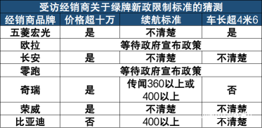 零跑經銷商説,這種無文件、無告知、無標準的暫停上牌,讓他們也非常苦惱。據他了解,價格、續航、長度、軸距還有設計時速都有可能成為獲取免費綠牌的技術門檻。