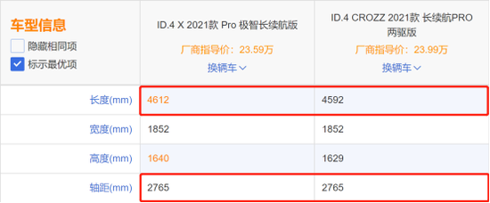 然後還有最近熱度頗高的一汽大眾和上汽大眾的ID.4系列,上汽大眾的ID.4 X車長4612毫米,一汽大眾的ID.4 Crozz車長4592毫米,比4.6米少了8毫米,而軸距兩車完全一樣。