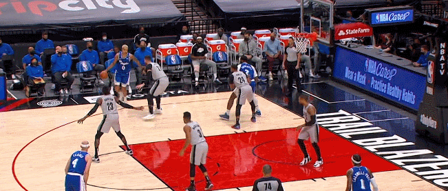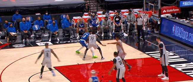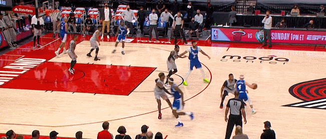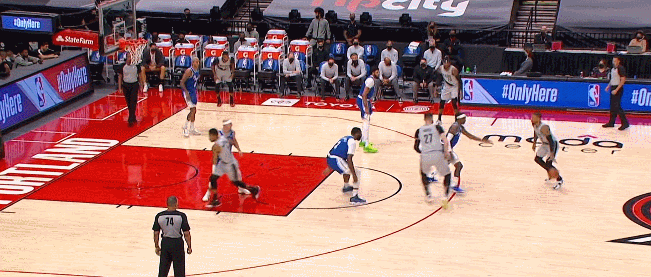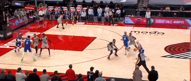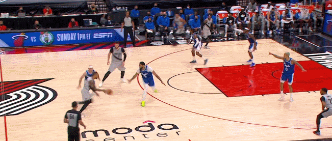 但是今天利指導的第一個運動戰進球是這樣的:第一節10分38秒,利拉德和努爾基奇弧頂發起擋拆,波普被完全擋住,莊神沒有第一時間防到外線,利拉德直接拔進一記三分。
