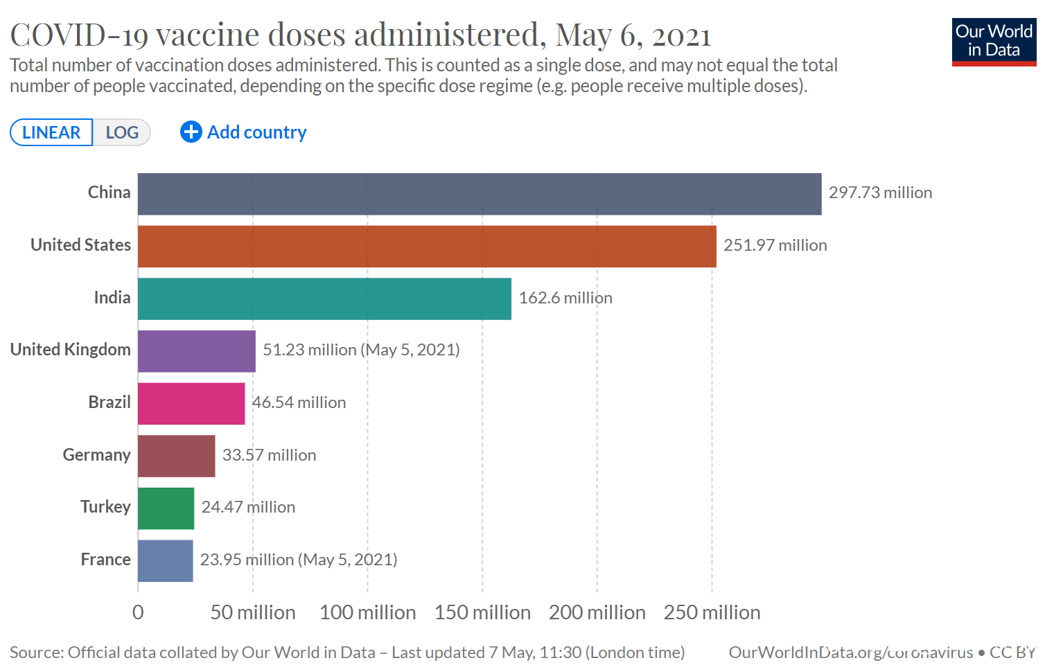 截止2021年5月6日,美國累計接種2.52億劑,居第二位,其中單日新增接種240萬劑。美國至少接種一劑的人羣佔比為44.7%,完成兩劑次的人羣佔比為32.6%。美國每百人累計接種75.34劑,是中國的3.52倍。自3月23日以來,美國日均接種279萬劑,為中國同期日均接種數的58%。