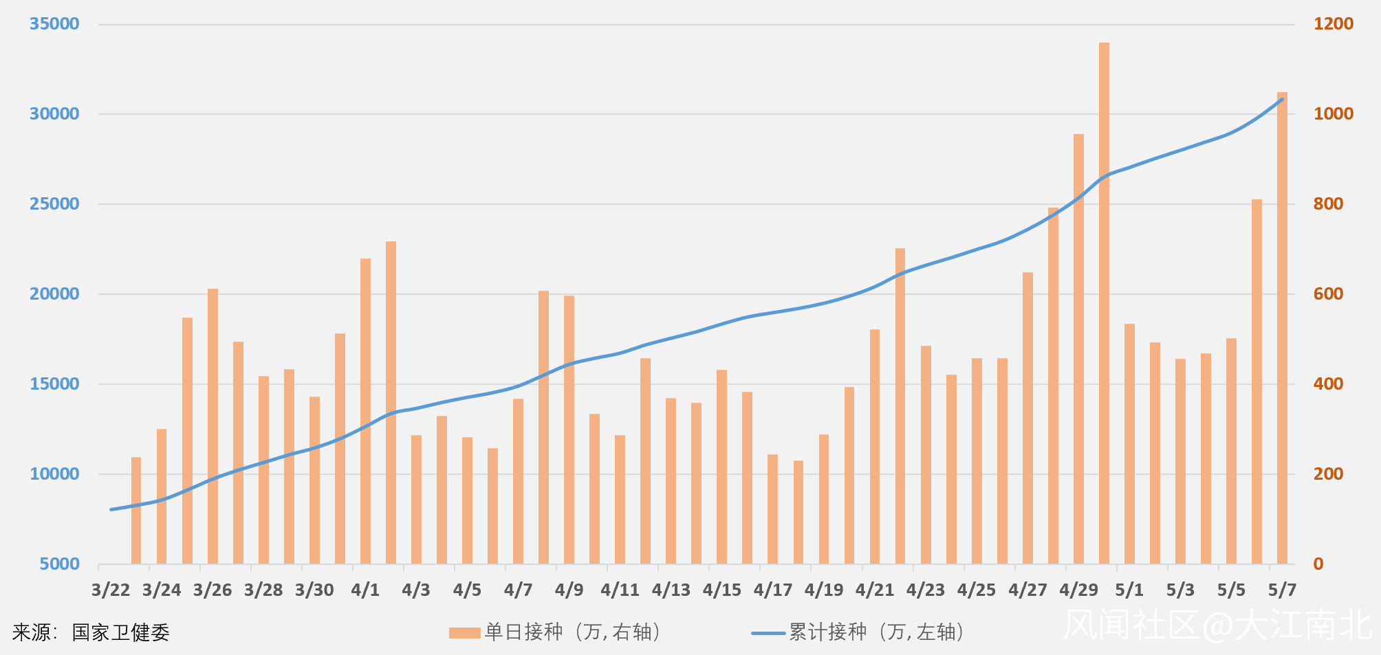 截止2021年5月7日,中國大陸累計接種新冠疫苗3.08億劑,突破3億劑大關,繼續位居全球第一位,其中單日新增接種1049萬劑,環比增加238萬例,繼4月30日之後單日再次突破1000萬劑大關。我國自3月23日以來,日均接種495萬劑。中國每百人累計接種21.41劑,環比增加0.73劑。