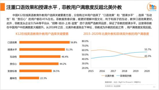 《2018年中國在線青少兒英語教育白皮書》顯示,當年近八成中國家長傾向於選擇口音純正、教學方式活潑的北美外教。而這和《2020年中國在線青少兒英語教育行業研究報告》中呈現的“家長更重視教師的教學實力,對外教的國籍偏好不明顯,菲教因其教學態度和課堂氛圍贏得大量家長的青睞”形成強烈對比。