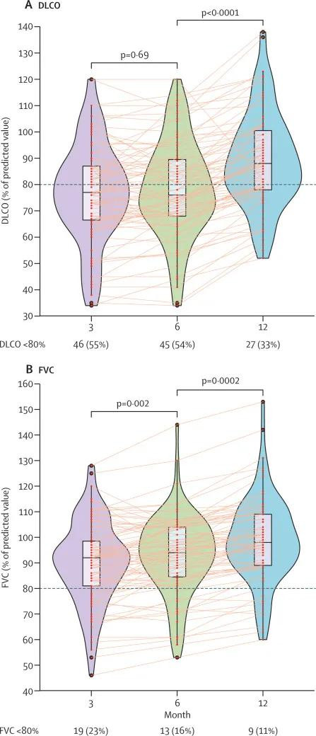 在12個月中,大多數患者的症狀、運動能力以及與新冠感染相關的肺部CT改變均得到改善。到12個月時,大多數患者似乎已經完全康復。然而,約5%的患者仍報告有呼吸困難。約三分之一(33%)的患者肺功能指標仍然偏低,尤其是一氧化碳彌散量(DLCO)——該指標反映了氧氣從肺部轉運到血液的效率,這一點在女性患者中更常見。
