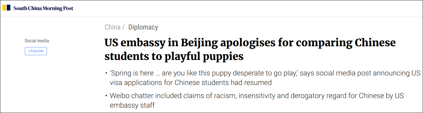 《南華早報》:美國駐華大使館為將中國學生比作頑皮的小狗而道歉
