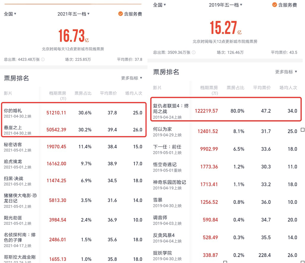 兩部頭部影片的票房勢均力敵,打破了往年檔期票房冠軍一家獨大的局面。《你的婚禮》和《懸崖之上》以5億的票房分別佔據檔期票房30%的份額,整體份額不過6成。而2018年《後來的我們》一部電影就拿走了檔期內64%的票房。更不用説2019年《復聯4》以12億分走了五一檔票房的80%。