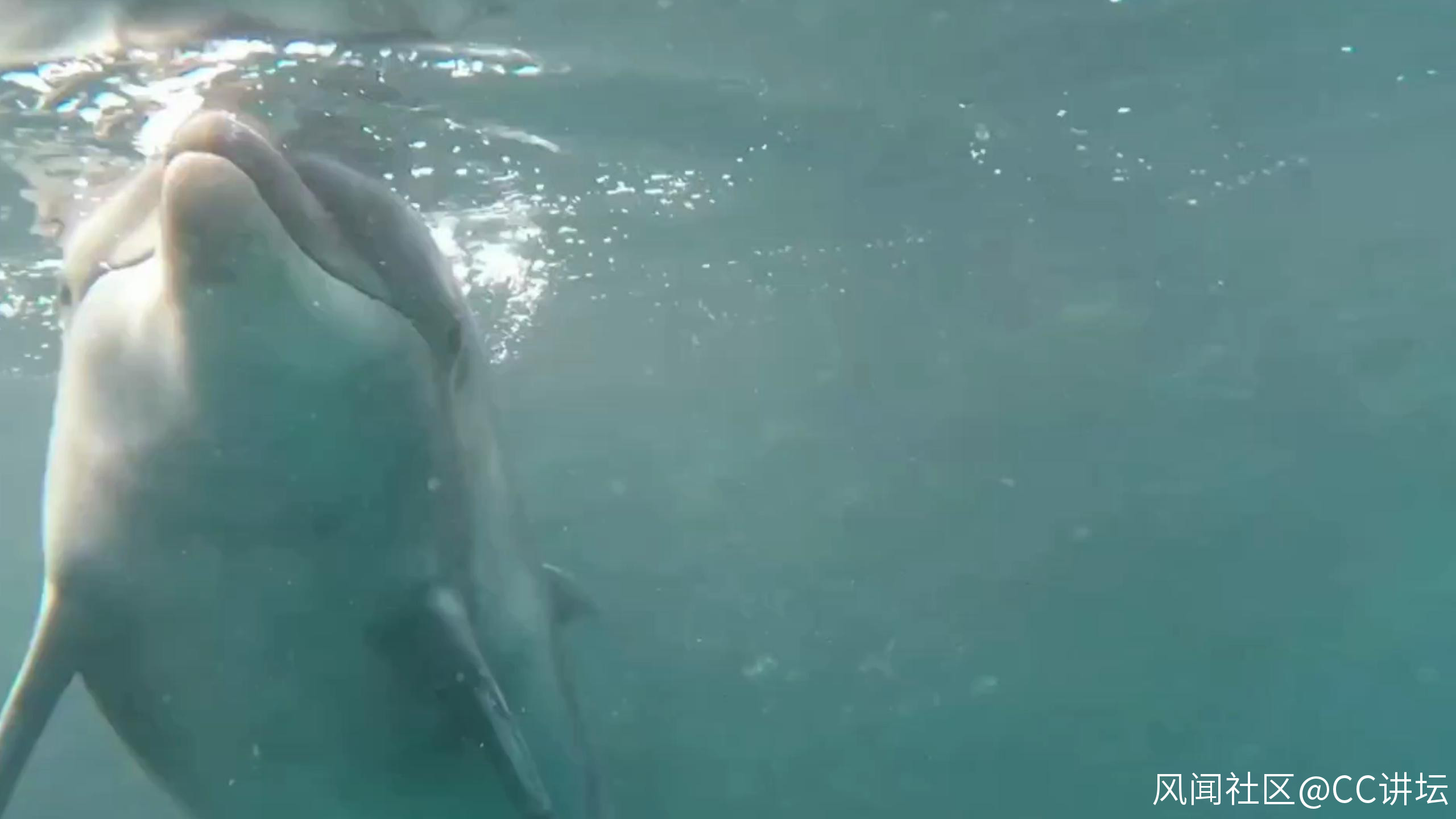 這裏我就特別想分享我的自由潛老師,它是一隻海豚,當時我去了一個海豚保護機構做志願者,在閒暇時間我想着學學自由潛吧,這樣可以幫他們分擔更多的一些水底的工作,但我就一直潛不下去,每次潛到一兩米的時候,我就會擔心自己會不會不夠氣,不敢換氣上不來。旁邊那隻海豚它就看到了,那一瞬間我看到它慢慢地遊向我了,不知道為什麼我們之間沒有任何語言,但是有一種感覺讓我覺得,好,倒數三秒鐘,我和它一起下去吧那樣的感受。我就倒數了三秒,然後3 2 1閉上眼睛往下潛,當睜開眼的那一瞬間,我發現它真的就像一個白色天使一樣,在水底跟我慢慢地往下潛。