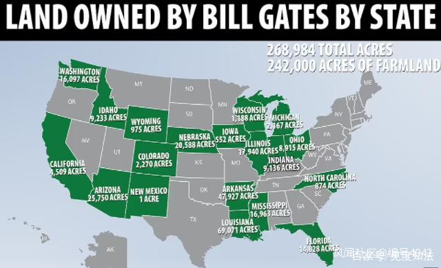 有報道統計,比爾蓋茨這位技術億萬富翁已經悄悄地在美國18個州購買了242,000英畝的農田,並在19個州總計購買了268,984個多用途土地,這使他成為美國最大的農業土地所有者。