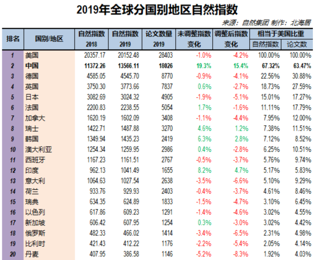 根據2019年自然指數國家排行榜,美國以20152.48排名第一,我國,以13566.11排名第二,美國是我國的1.49倍。