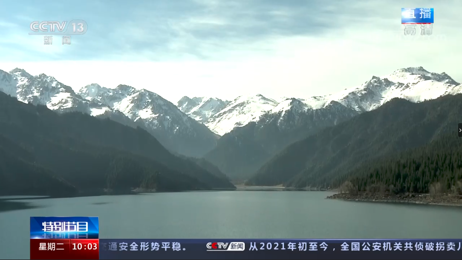 天池,正在被天山環抱着。湖面月半婀娜,湖色千般婉約。