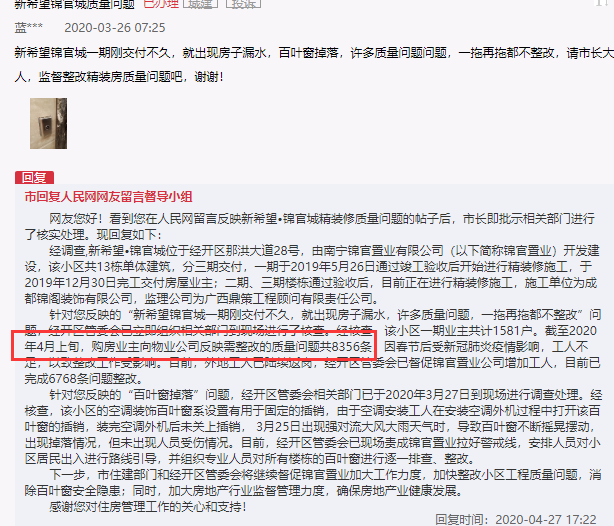 比如去年人民網地方領導留言板顯示,南寧新希望錦官城一期,截至2020年4月上旬,購房業主向物業公司反映需整改的質量問題多達8356條。