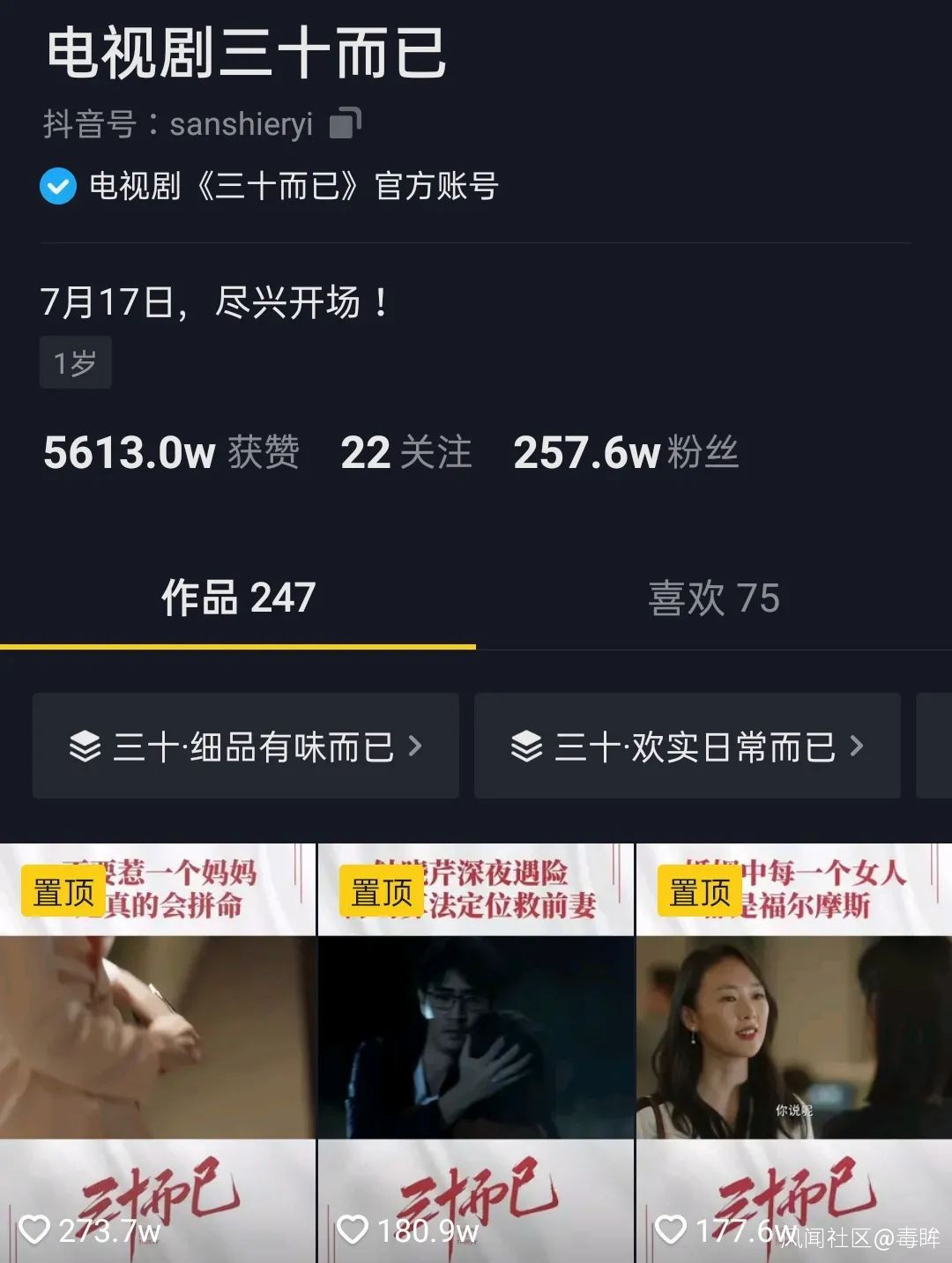 比如《三十而已》劇集官方賬號在抖音上就有257.6萬粉絲,發佈了247個視頻作品,獲得了5613萬點贊。