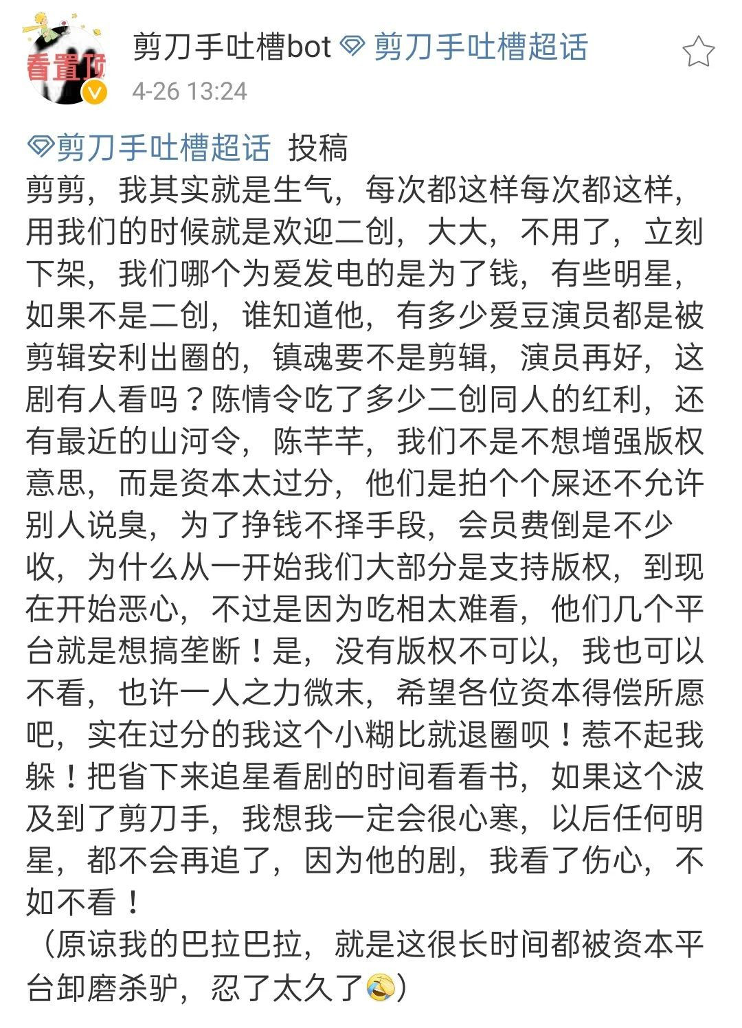 還有用户評論道,“以後誰再冒着侵權風險放原片,做二創安利,那就是假的了,都是買的,這真是要把沒錢買營銷,只能靠自來水的好劇情搞死哦,劣幣驅逐良幣。”