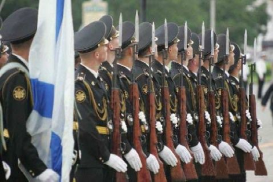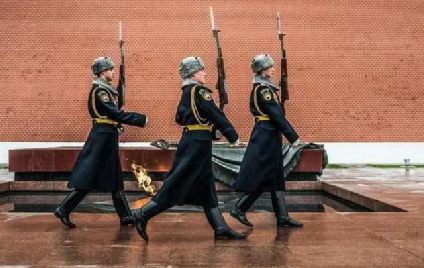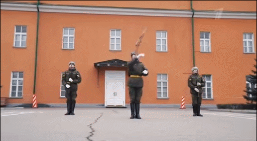 除此之外,俄羅斯儀仗隊還獨創了一門行進間託槍的本事,槍身遠離身體,不論行進的姿態如何,單手託着槍而槍不倒。