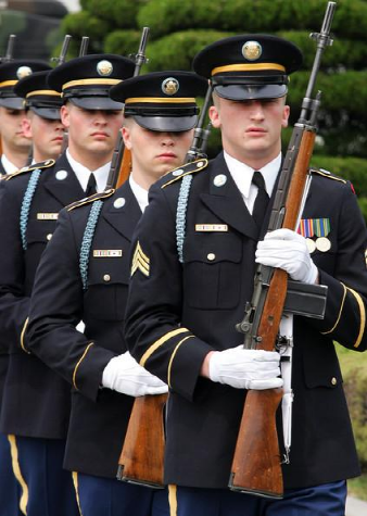 比如美國三軍儀仗隊善長做行進間動態耍槍、拋槍的表演,不但大幅度耍槍、拋槍動作非常精彩,而且動作整齊一致,觀賞性極佳。