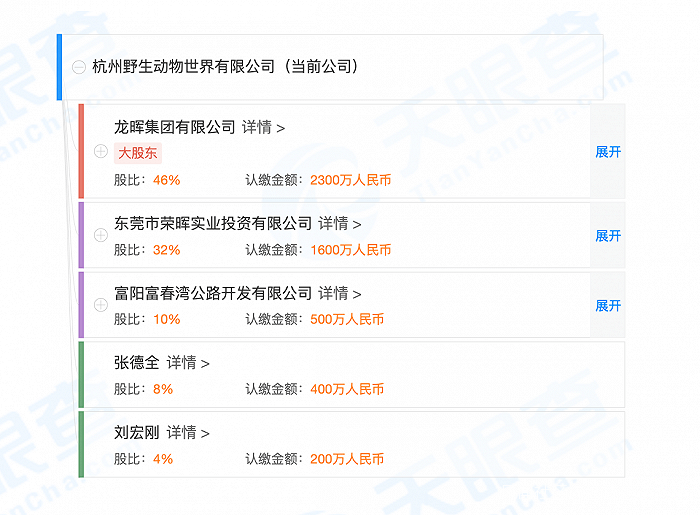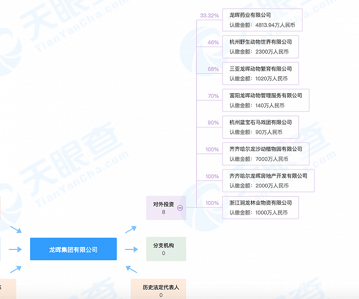 天眼查信息顯示,杭州野生動物世界背後企業主體為杭州野生動物世界有限公司,該公司大股東為龍暉集團有限公司(以下簡稱“龍暉集團”),持股46%,龍暉集團產業佈局廣闊,覆蓋動植物園、馬戲團、動物繁育、房地產和醫藥等板塊。