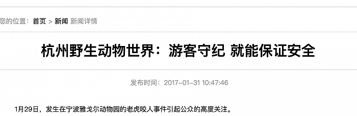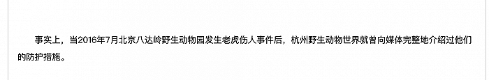 而頗有意思的,在2016年北京八達嶺野生動物園老虎傷人事件和2017年春節期間生寧波雅戈爾動物園的老虎咬人事件發生後,杭州野生動物世界當時都曾出面接受媒體採訪大談野生動物園安全管理的經驗。