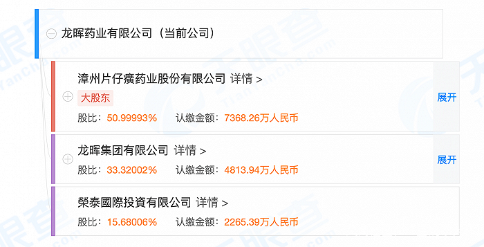 在醫藥上,龍暉集團目前擁有參股子公司龍暉藥業有限公司,持股比為33.3%,該公司控股股東為知名中藥上市公司片仔癀,持股51.0%。不過,實際上龍暉藥業最早是由龍暉集團與香港榮泰國際投資有限公司共同出資組建的合資企業,2020年7月片仔癀以自有資金累計約4447.59萬元取得龍暉藥業51%的股權。這是也片仔癀上市以來,首次實施外延式產業併購,當時業內聲音認為片仔癀此舉或為拿下龍暉藥業旗下安宮牛黃丸等知名中藥品種文號。