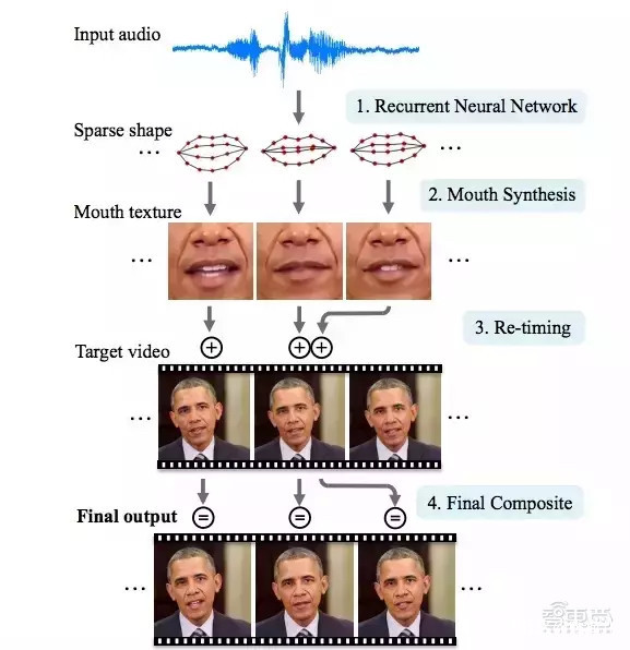美國華盛頓大學基於公開的奧巴馬音視頻片段,用AI分析了數百萬幀影像,以確定奧巴馬嘴唇、牙齒、嘴角等臉部變化,生成了口型幾乎完美匹配、高度逼真的假視頻。