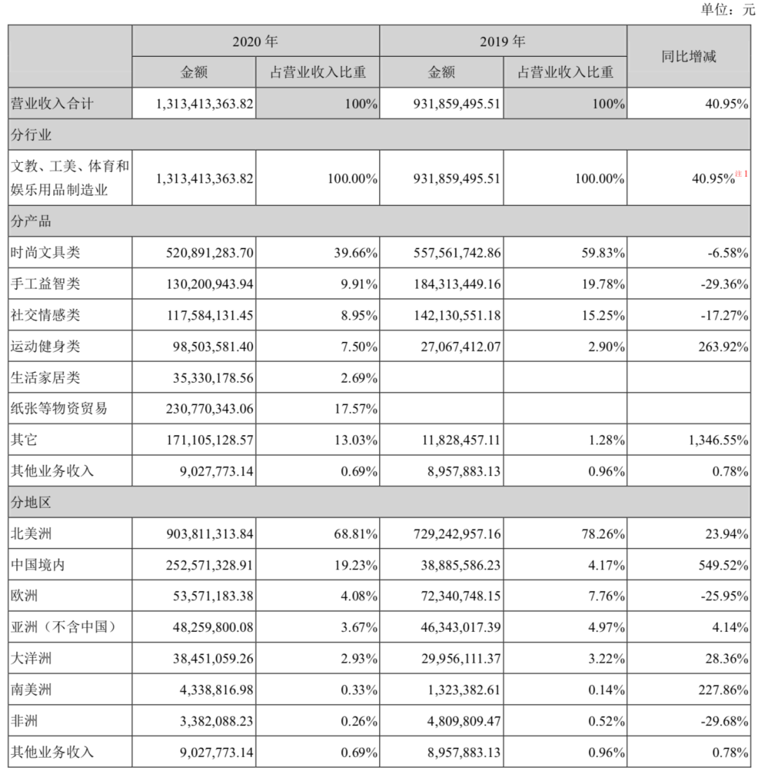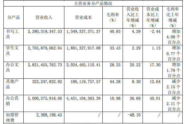 這些營收,來自公司主營的七大類產品,分別為:時尚文具、手工益智、社交情感、運動健身、生活家居、紙張等物資貿易及其他。