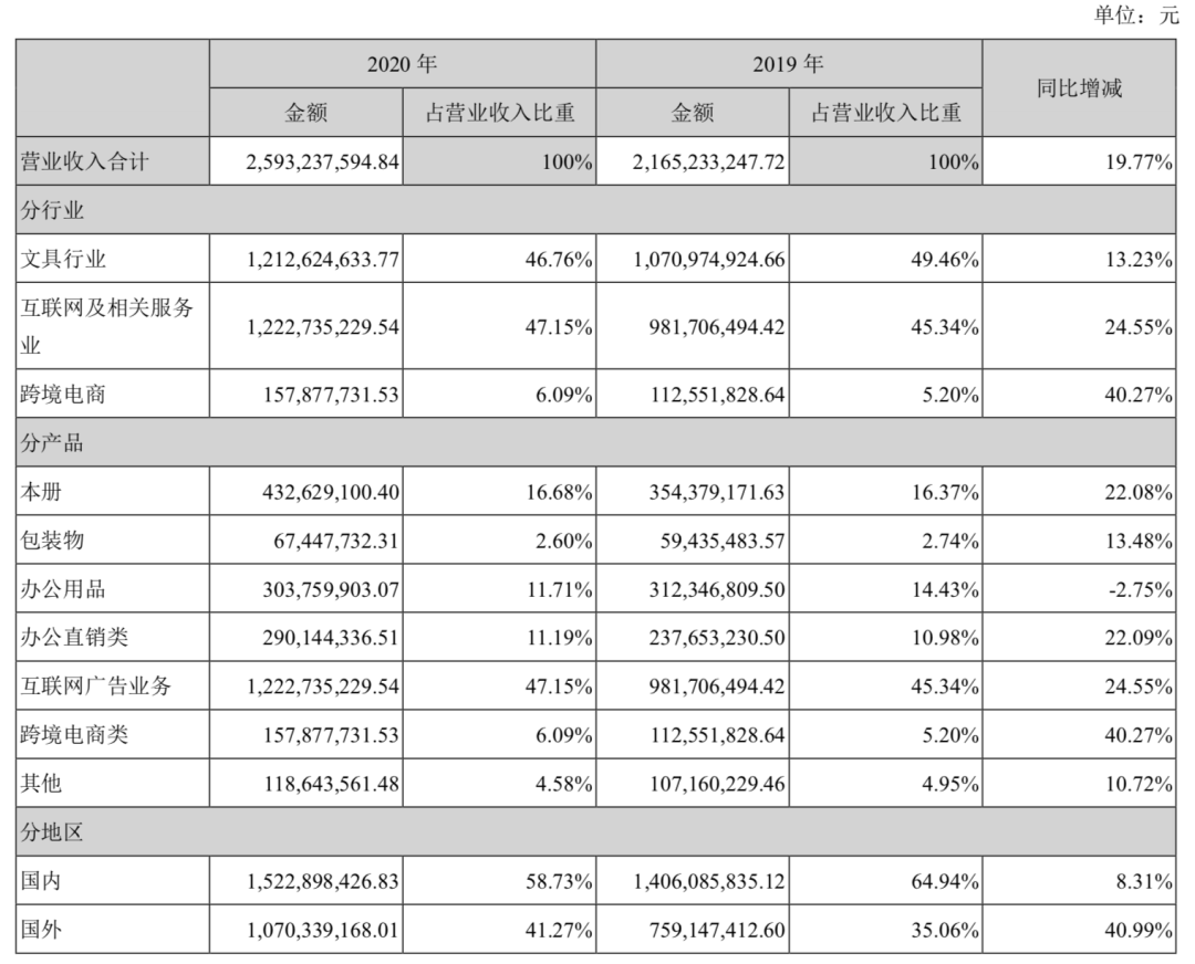 2020年,公司的營收來自三大業務:文具業務、互聯網廣告營銷與服務。其中,文具業務帶來的營收為12.12億元,在總營收中佔比46.76%,同比2019年增長13.23%。銷售量方面,2020年售出文具產品27.13億個,同比增長11.05%。