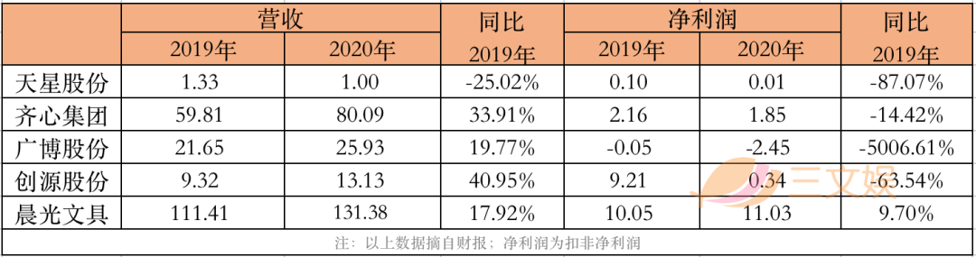 如,三文娛統計的天星股份、齊心集團、廣博股份、創源股份和晨光文具,2020年的營收分別為1億元、80億元、25.93億元、13.13億元和131.38億元,同比2019年的增長情況為-25.02%、33.91%、19.77%、40.95%和17.92%。