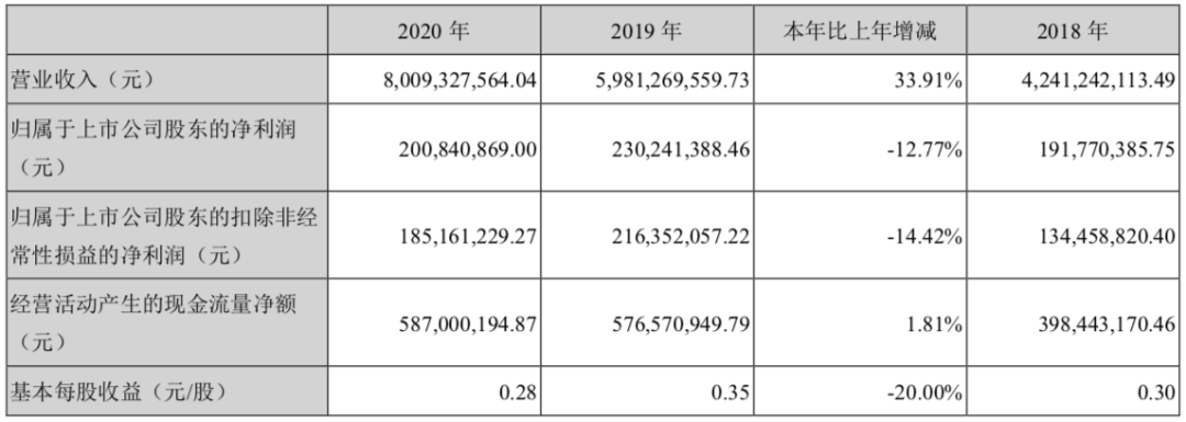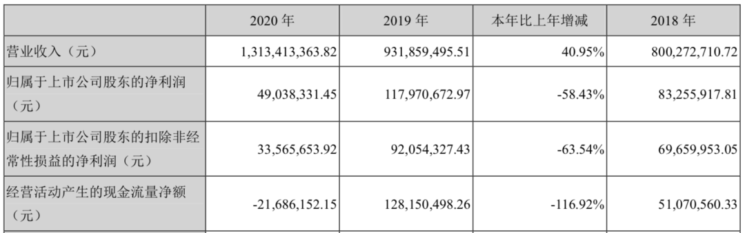 2020年,創源股份實現營收13.13億元,同比增長40.95%;扣非淨利潤3357萬元,同比下降63.54%。