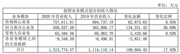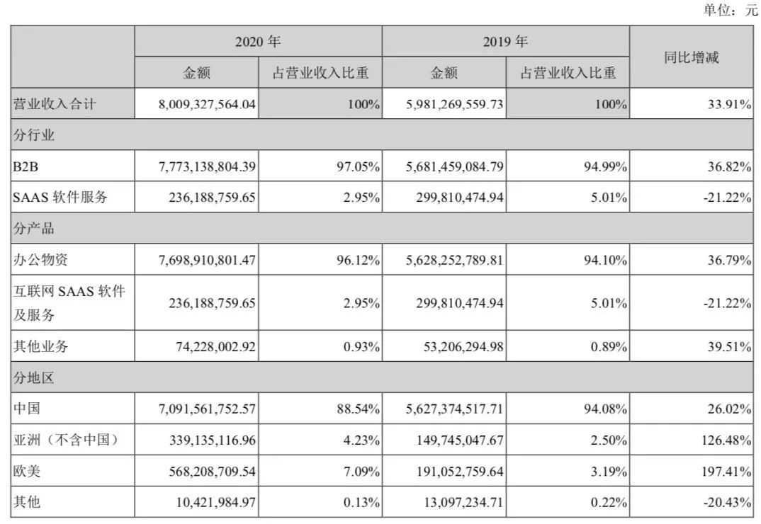 2020年,來自辦公物資的營收為77億元,在總營收中的佔比超過了96%,比2019年同期增長l了36.79%。