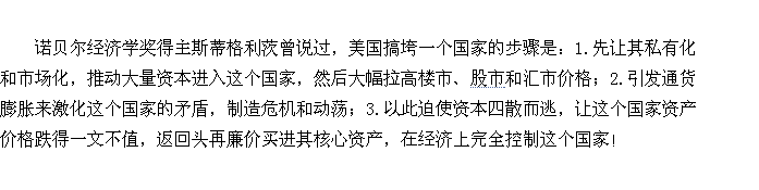 諾貝爾經濟學獎得主斯蒂格利茨曾説過,美國搞垮一個國家的步驟是: