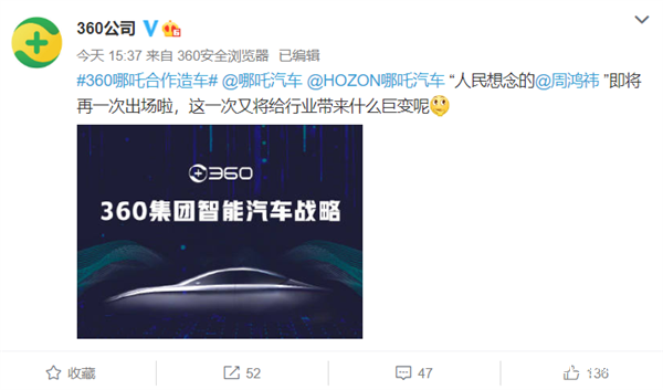 5月10日,**360公司在其官方微博發文稱,將攜手造成新勢力之一的哪吒汽車,正式進軍智能汽車領域。**同時配圖為“360集團智能汽車戰略”,預計雙方將於近期召開新聞發佈會,並公佈本次合作計劃的更多細則。