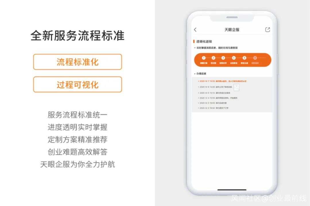 **第四,看流程標準化、信息透明化。**在天貓網購時,消費者可以實時看到商品詳情、物流信息等,甚至由哪個快遞員配送都會在平台直接顯示。同理,在天眼企服標準化平台上,企業也可以清晰地瞭解自己所選擇的服務所需時間,在服務中進行到哪一步,或者哪個環節卡住了,企業跟進更方便並且可實現針對性地監督與解決。