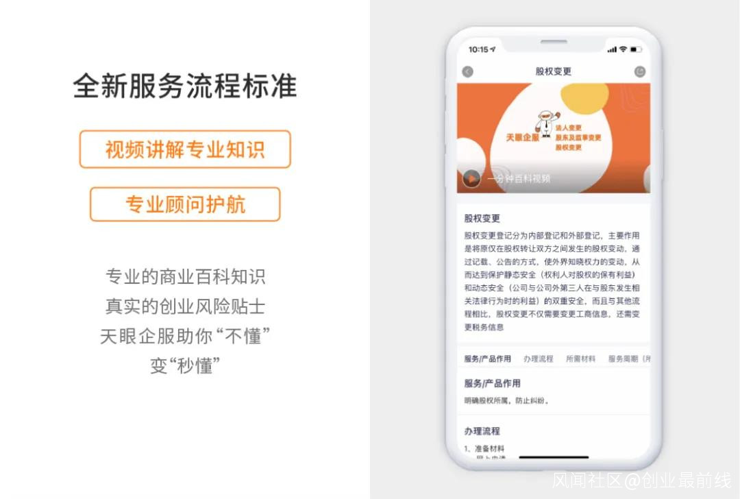 據瞭解,天眼企服平台針對企業服務中普遍存在的痛點,在服務商准入、服務流程、服務定價和知識普及方面建立四大標準,從而搭起企服標準化的“台子”;在工商註冊、財税代辦、知識產權等9大高頻領域推出300餘個細分品類的企業服務,滿足了企業從開創到成熟的全週期發展需求。
