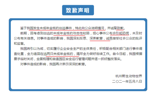 之前,杭州野生動物世界一直否認有豹子出逃。直到5月8日下午,富陽官方發佈消息確認杭州野生動物世界出逃3只金錢豹,杭州野生動物世界才在致歉信中提到,3只金錢豹“前期”已出逃。