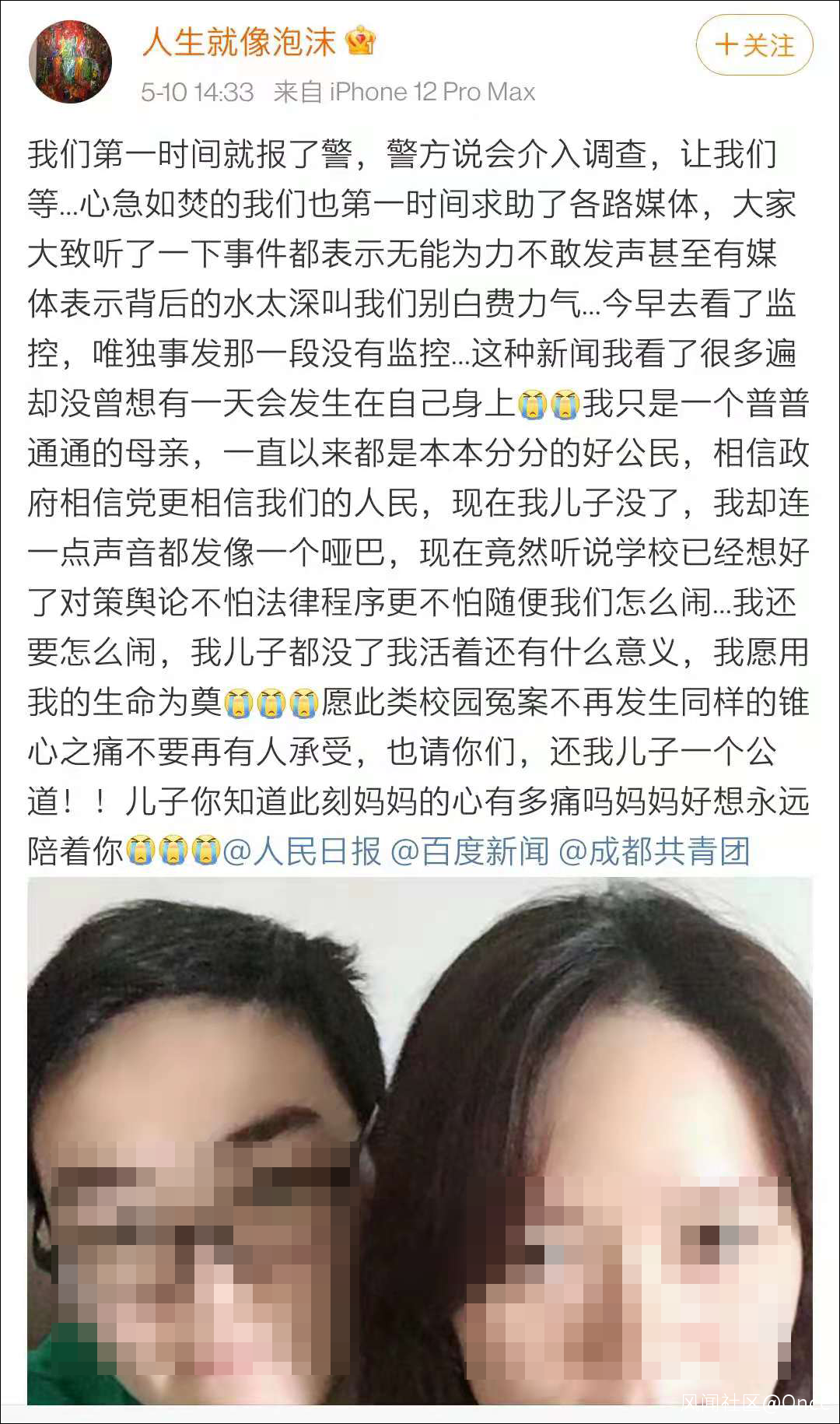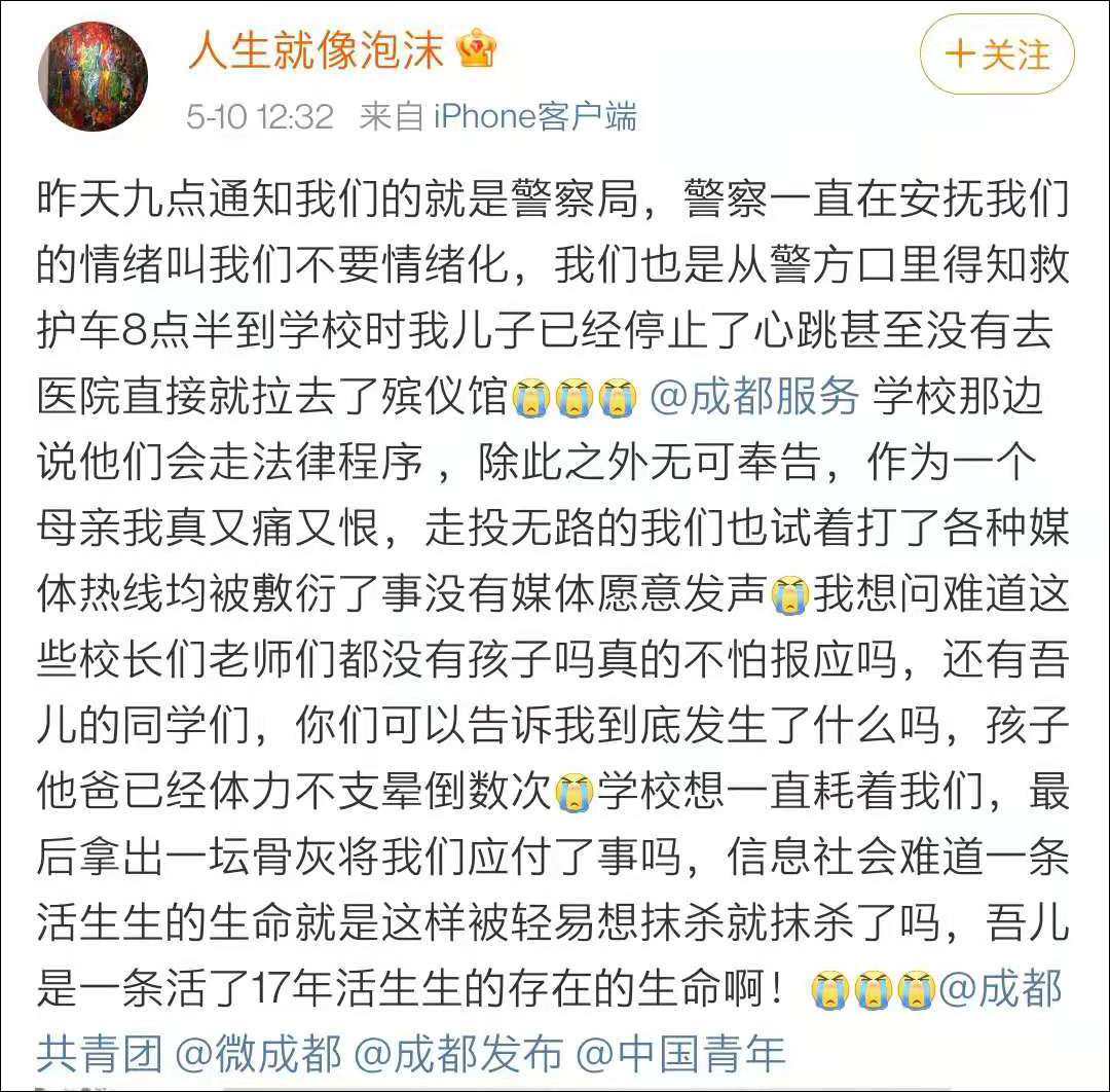 @人生就像泡沫 寫道:“學校方簡單告知了我死因是從樓道墜落…學校現在的做法是,將我們家長全部拒之門外無可奉告,想看監控不給看,想問問同學老師到底發生了什麼,學校第一時間遣散了班裏所有學生並警告他們三緘其口…我們在校門口守到深夜 ,沒有任何正面的回答。”