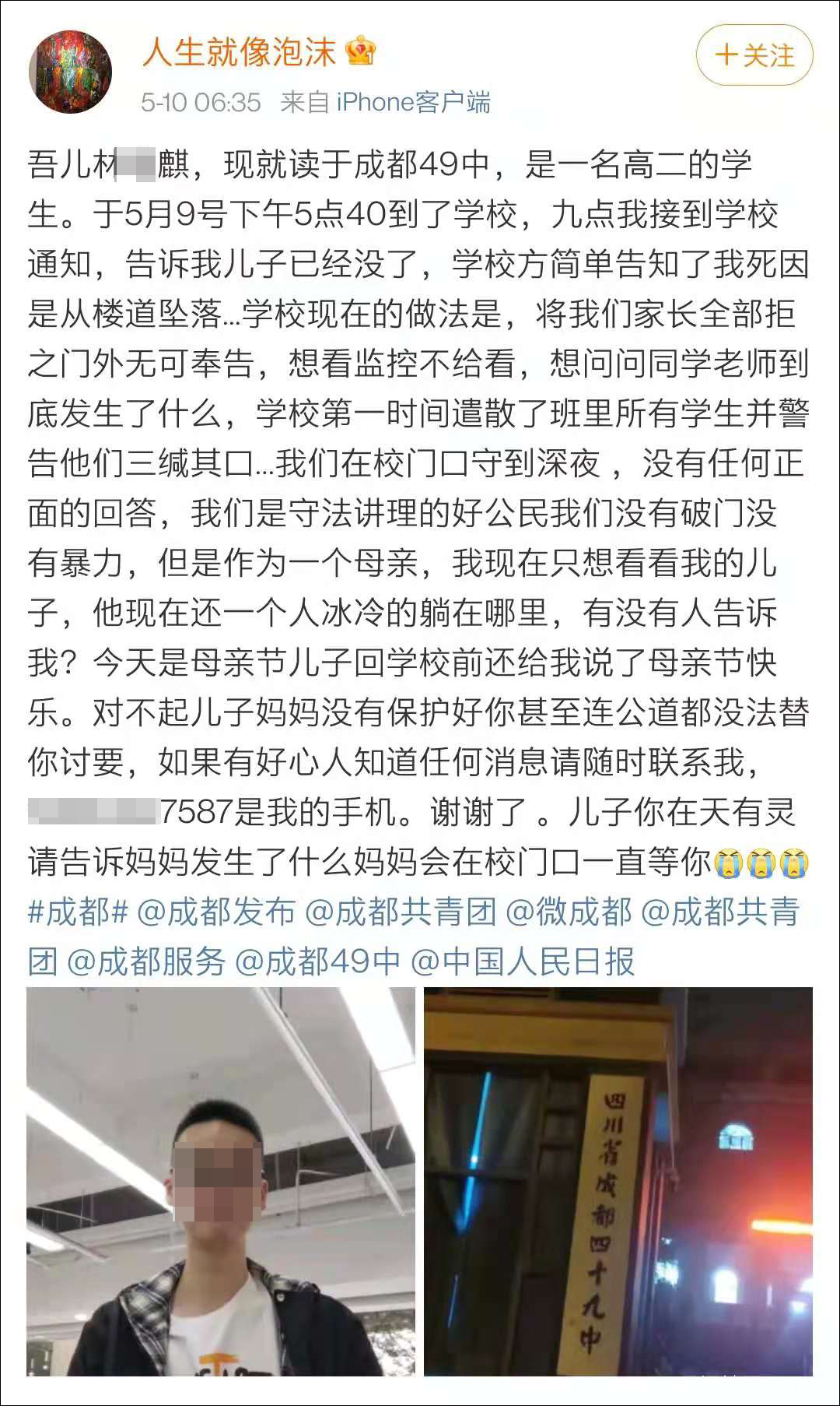 5月10日早上6:35,網友@人生就像泡沫 微博發文稱,自己5月9日接到成都第四十九中學校發來的信息,告知兒子林某麒從學校樓道墜落身亡。