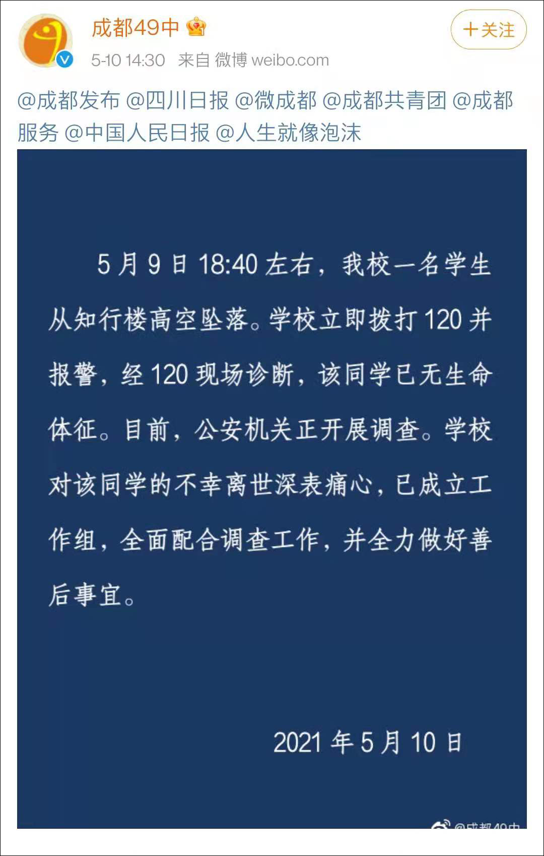 10日下午14:30,成都四十九中官方微博@成都49中 發佈聲明回應此事,並且@了死者母親@人生就像泡沫。